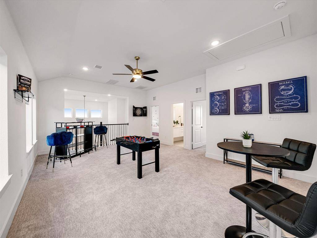 Ready Now! Furnished model Home. Feel like a Royal in our Alexander floor plan. Step into the epitome of modern living with this brand-new Monarch Home, where architectural sophistication blends seamlessly with everyday comfort. This 4-bedroom, 3.5-bath masterpiece includes a spacious game room and a functional pocket office, offering versatility for both entertainment and work-from-home lifestyles. Designed for discerning tastes, the home boasts premium finishes throughout. The Chef-Inspired Kitchen is outfitted with a JennAir appliance package, including double ovens and a 5-burner gas cooktop, making it a culinary dream. Enjoy the elegant touch of quartz countertops, a pot filler, Blanco Silgranit sink, and soft-close cabinetry with upgraded hardware. A decorative backsplash adds a sleek, modern flair. Gather around the crystal-accented gas fireplace under the ambient glow of luxury Kichler lighting. The Karastan Cultivated wood flooring in common areas downstairs as well primary bedroom, combined with 8-foot doors and 12x24 sleek tile accents, creates a clean and contemporary vibe. The Resort-Worthy Primary Suite has a luxurious primary bath featuring floating cabinets, a large frameless glass shower, decorative tiles, framed mirrors, and quartz countertops with undermount sinks.