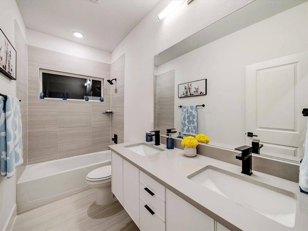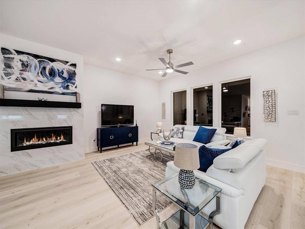 Ready Now! Home is a furnished model. Feel like a Royal in our Elizabeth plan. Step into the epitome of modern living with this brand-new Monarch Home, where architectural sophistication blends seamlessly with everyday comfort. This 5-bedroom, 4.5-bath masterpiece includes a spacious game room and a functional pocket office, offering versatility for both entertainment and work-from-home lifestyles. Designed for discerning tastes, the home boasts premium finishes throughout. The Chef-Inspired Kitchen is outfitted with a JennAir appliance package, including double ovens and a 5-burner gas cooktop, making it a culinary dream. Enjoy the elegant touch of quartz countertops, a pot filler, Blanco Silgranit sink, and soft-close cabinetry with upgraded hardware. A decorative backsplash adds a sleek, modern flair. Gather around the crystal-accented gas fireplace under the ambient glow of luxury Kichler lighting. The Karastan Cultivated wood flooring in common areas downstairs, combined with 8-foot doors and 12x24 sleek tile accents, creates a clean and contemporary vibe. The Resort-Worthy Primary Suite has a luxurious primary bath featuring floating cabinets, a large frameless glass shower, decorative tiles, framed mirrors, and quartz countertops with undermount sinks.