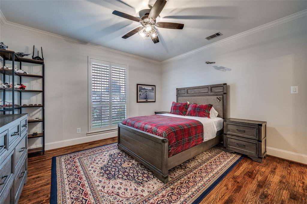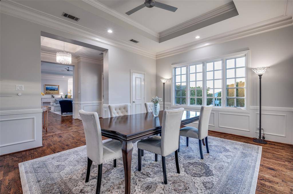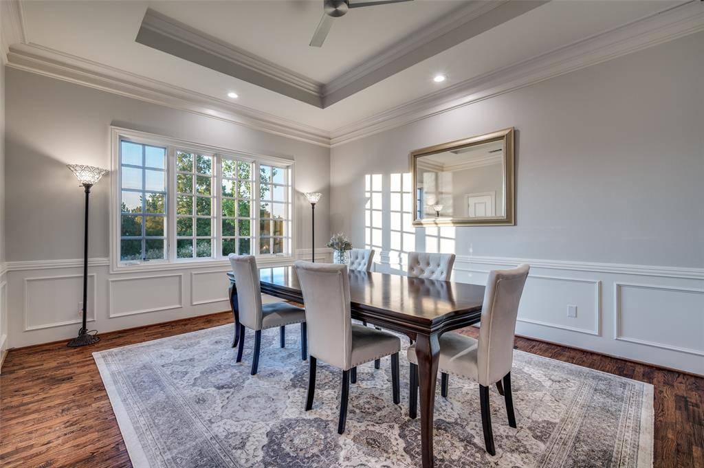 Located in the prestigious, guard-gated golf course community of Stonebriar Village, this stunningly updated, single-story, custom home offers 3,500 square feet of move-in ready, low-maintenance luxury on an oversized, elevated corner lot with mature trees and established landscaping. Custom, iron doors open to light-filled interiors tastefully refreshed with soothing designer paint palette, real hardwood floors, refined millwork (they don't make them like they used to), designer lighting and a flexible, spacious floor plan. Walls of floor-to-ceiling windows bathe the open-concept layout in natural light. The remodeled gourmet kitchen is both elegant and functional, featuring marble countertops, designer backsplash, crisp white cabinetry, and premium LG Signature Series stainless steel refrigerator, ovens, microwave, wine chiller, induction cooktop and dishwasher. The kitchen flows effortlessly into the inviting living room with fireplace and a bright breakfast nook. The private primary suite offers a peaceful retreat with a sitting area and luxurious split his-and-hers baths showcasing marble vanities, a jetted soaking tub, remodeled walk-in shower with seamless glass, and custom closets. Additional spaces include the stately, formal dining room, dedicated formal study with fireplace and sliding doors to a charming, covered morning porch, as well as a versatile bonus room ideal as a media or game room, second study, or creative space. Outdoor living is equally inviting, with a flagstone patio and pergola perfect for relaxing or entertaining. Thoughtfully upgraded with modern systems for comfort and efficiency, along with substantial exterior improvements including a Class IV impact-resistant roof, new skylight, gutters, garage doors, and refreshed landscaping.