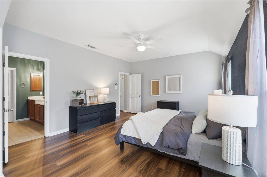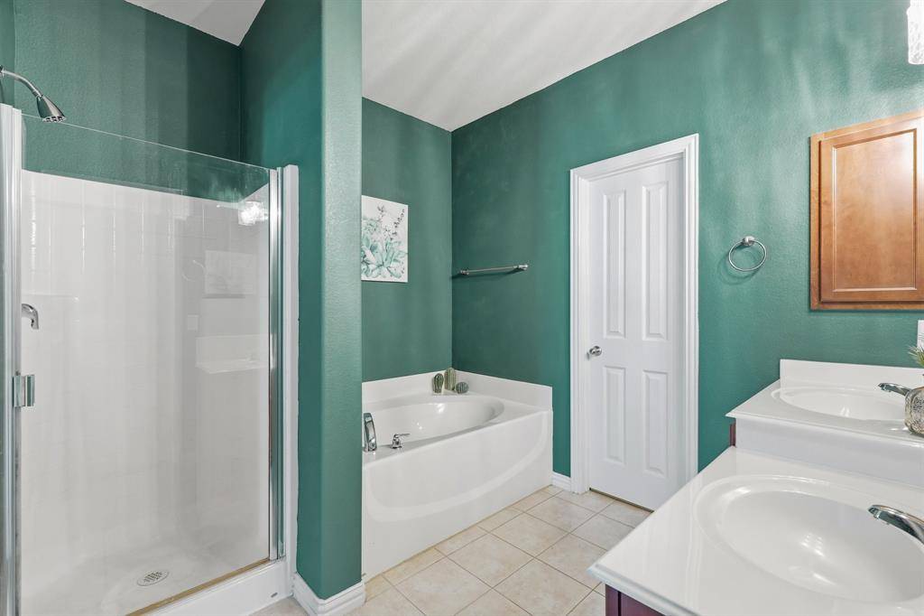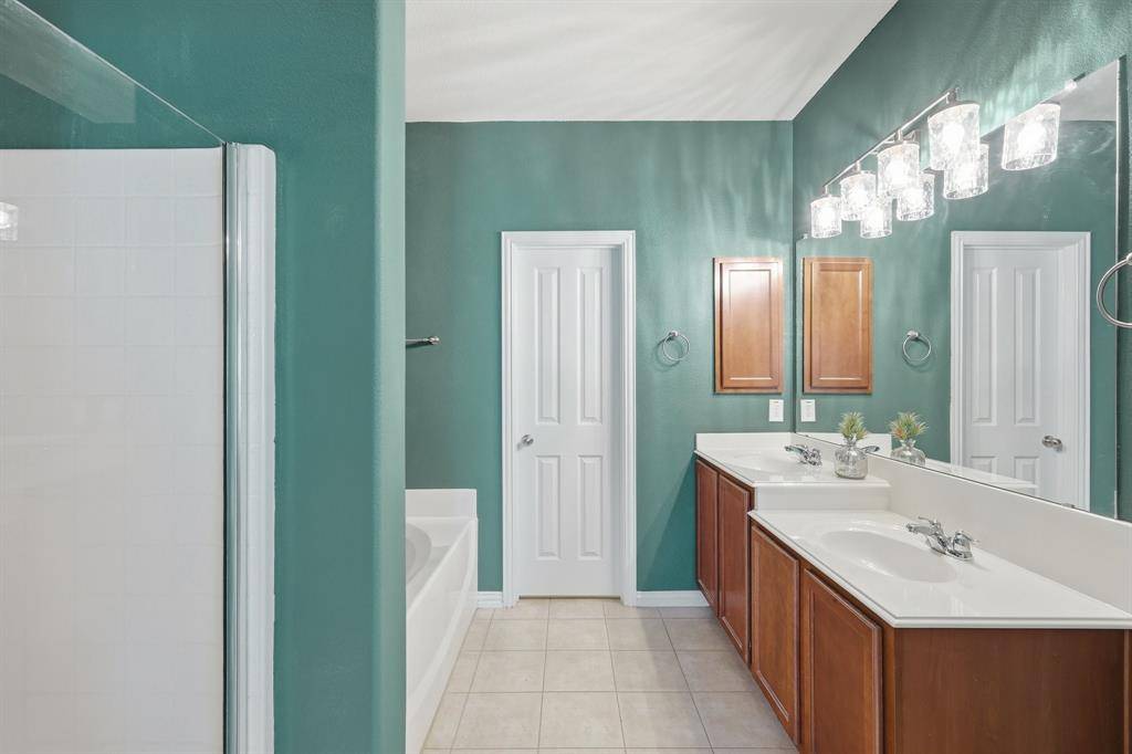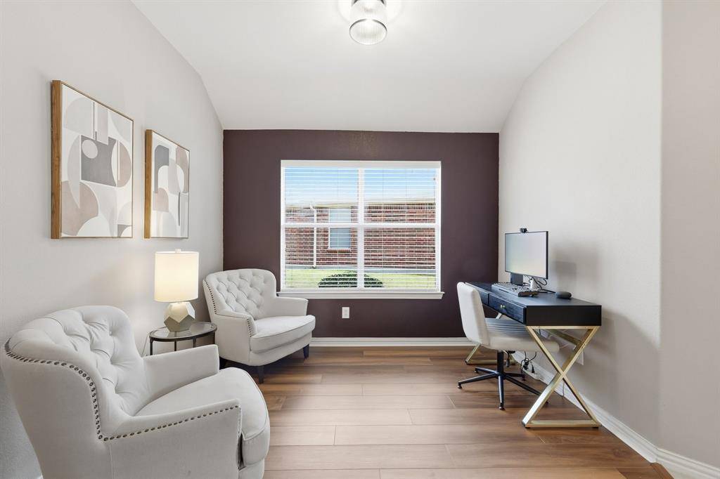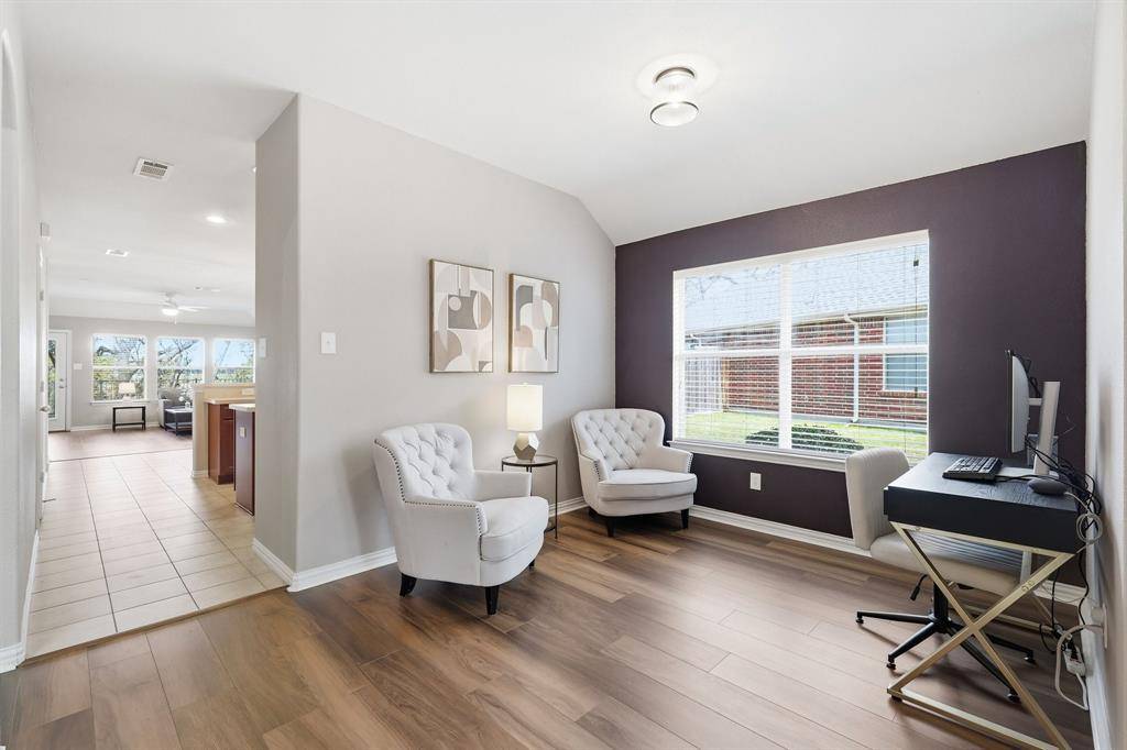 The kitchen features plenty cabinet and counter space, a gas range, stainless steel refrigerator and a cozy breakfast nook. The oversized primary bedroom is a true retreat, complete with a large sitting area that can be used flexibly as a reading nook, nursery, workout space, or secondary office. The primary bath offers dual vanities, a garden tub, separate frameless shower, and a walk-in closet.