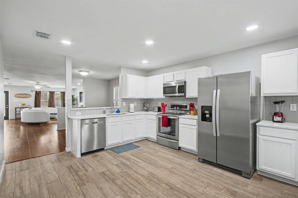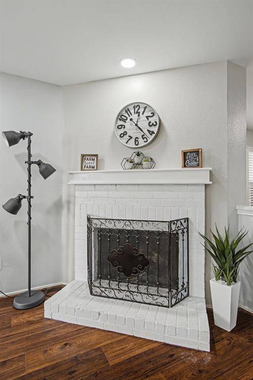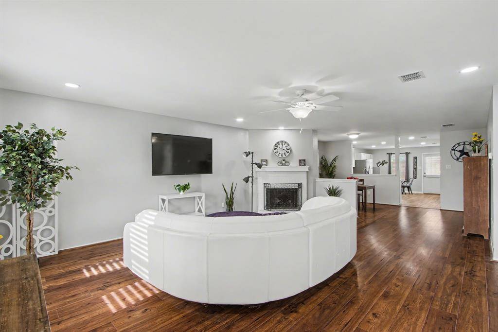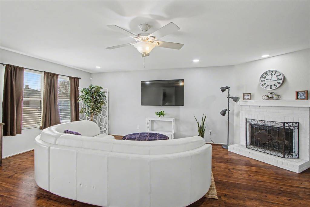 Modern updates flow throughout the home, beginning with a bright, stylish kitchen featuring white cabinetry, quartz countertops, subway tile backsplash, stainless steel appliances, and a dedicated coffee bar area. The open living space is warm and welcoming with a corner brick fireplace and wiring ready for your flat-screen TV.