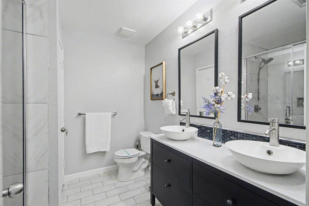 The spacious primary suite provides a relaxing retreat with raised bowl sinks, modern finishes, and a walk-in shower. Secondary rooms offer flexibility for guests, work, or play.