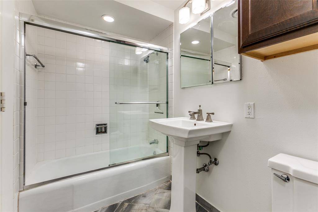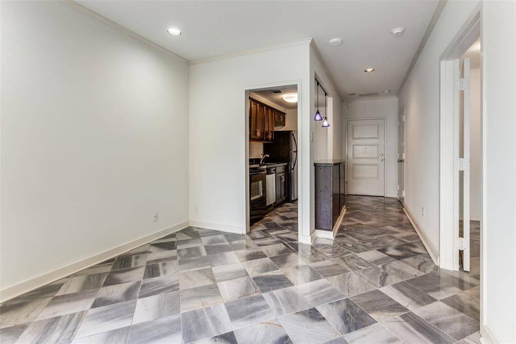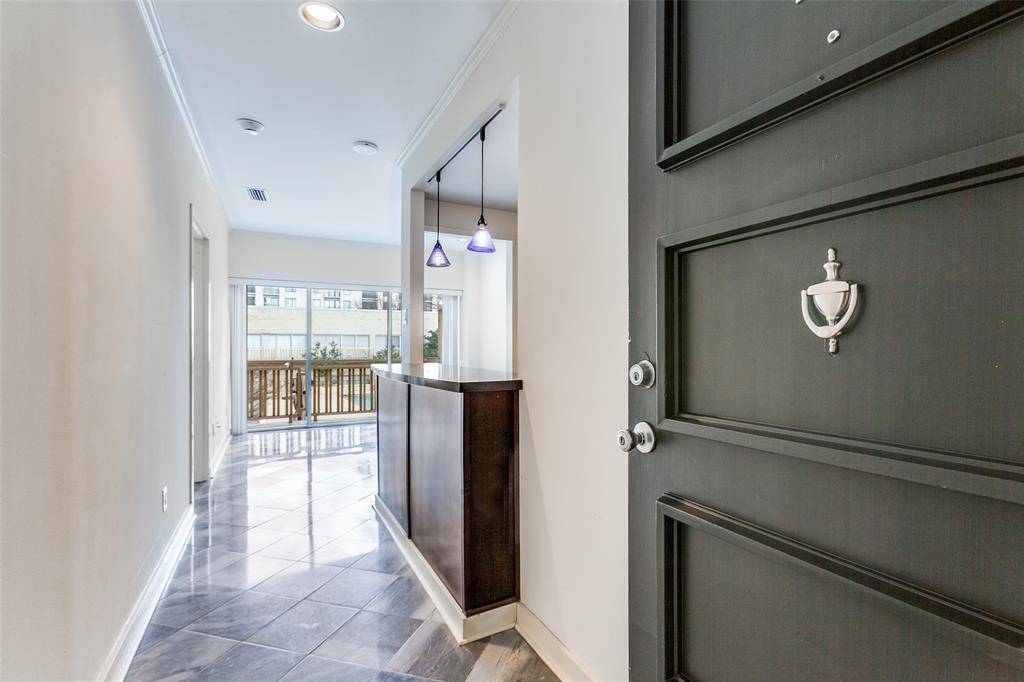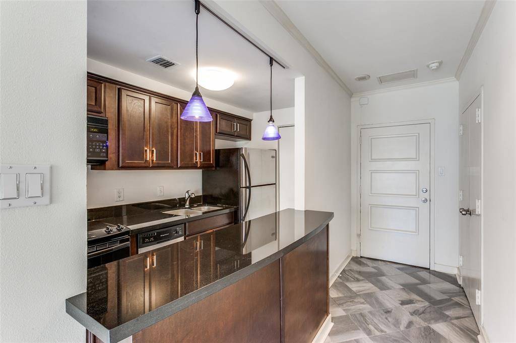 One bedroom, one bath poolside condo at Preston Tower offers economical living in a prime Preston Hollow location. This 2nd-floor Garden Building unit has a beautiful view of the landscaped pool courtyard and firepit. The compact 544 sq. ft. floor plan features a well-appointed galley kitchen with breakfast bar, ample closet space, an office nook in the bedroom, and wall-to-wall windows that open to a private balcony. Easy in & out unit is adjacent to the elevator servicing the basement and a stairwell. Many building upgrades have recently been completed, including a new fire alarm system, roof replacement, and refurbishment of the elevators and common hallways. Preston Tower offers the ultimate low-maintenance lifestyle with amenities such as round-the-clock front desk and basement attendants, fitness center, community room with kitchen and library, pool area with fire pit, basement laundry room, tennis-pickleball court, and a dog park. Various on-site services are located on the building's first and second floors, including a coffee shop and Bernie's bar. The desirable Preston Hollow location is within walking distance of Preston Center shops and restaurants, with easy access to NorthPark, Preston Royal, US-75, and DNT. Monthly HOA dues cover all utilities, HVAC maintenance, and high-speed internet service.