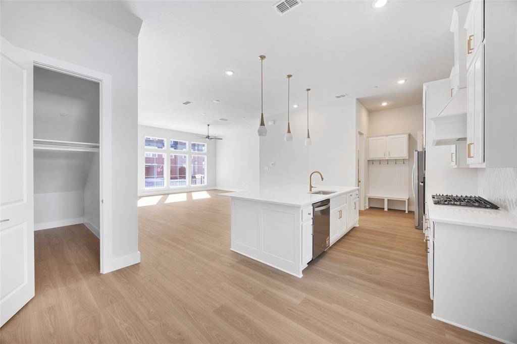 The open-concept first floor is ideal for both everyday living and entertaining, showcasing a chef's kitchen with an oversized island, premium finishes, ample cabinetry, and seamless flow into the dining and living areas. Natural light fills the home, highlighting the modern design and upscale craftsmanship throughout.