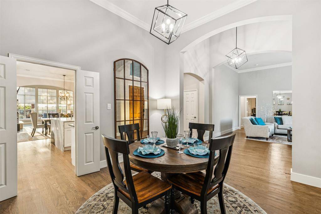 Perfect blend of classic charm and modern sophistication in this beautiful home in Willow Ridge that is zoned for WALNUT GROVE HIGH SCHOOL and Prosper ISD! From the moment you step inside, you'll be impressed by the warm and inviting formal dining and living area. As you walk in you will see the spacious family room, vaulted ceilings, a stunning stone fireplace, crown molding, plantation shutters, hardwood floors that extend throughout the main level, and 5 inch base boards throughout the house. The centerpiece of the home is the oversized waterfall granite island, European cabinets, glass cabinetry, stainless steel appliances, a double oven, tile backsplash, and cabinet lighting, this kitchen is designed to impress. Your primary suite is a true retreat, featuring a cozy sitting area, a custom closet, and a spa-like bathroom with marble floors, quartz countertops, walk-in to an elegant marble tiled shower, deep soaking tub, extended quartz vanity, refined finishes, and an additional HVAC system for primary suite. The main level also boasts a secondary bedroom with ensuite bath, two additional bedrooms that share a thoughtfully designed dual access bathroom. Upstairs, you'll find a LARGE Flex room with full bath that can be used as a FIFTH bedroom, media room, or game room! Upstairs is an easily accessed entry to the large walk-in attic. With meticulous details, ample storage including a 3 car garage, and premium finishes throughout, this home effortlessly blends comfort with everyday luxury. Escape to your own backyard retreat, where you will see a modern style sparkling pool and spa invites you to relax, or enjoy the evenings under the covered patio looking out to an empty corn field. The sparkling pool system was installed in 2021, adding hot water heaters, a circulating pump and sun tan ledges. Over quarter acre lot. Located just minutes from dining and shopping in the Gates of Prosper and to the Dallas North Tollway, this home offers unmatched convenience.
