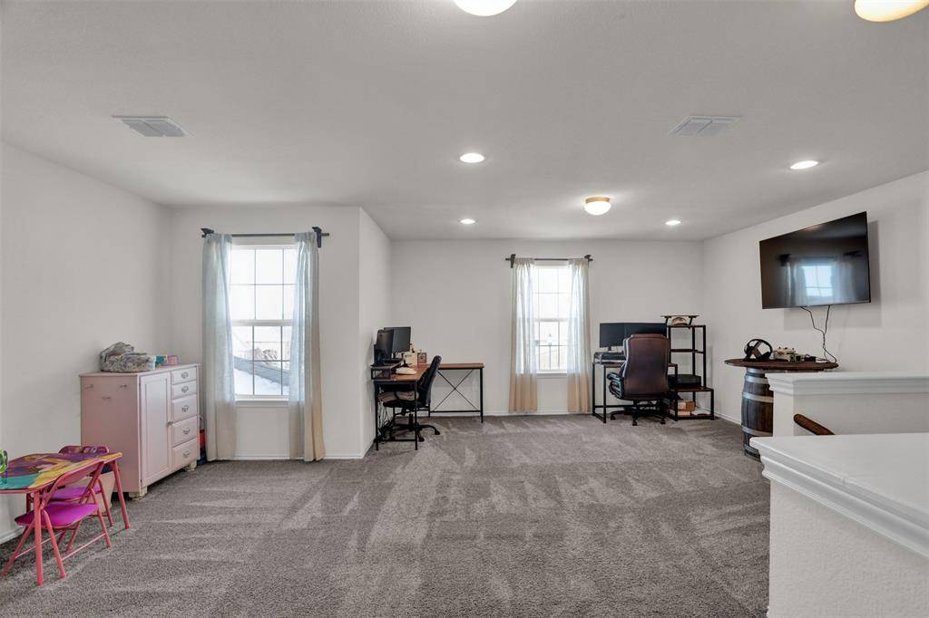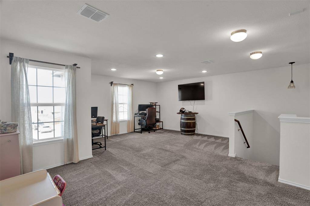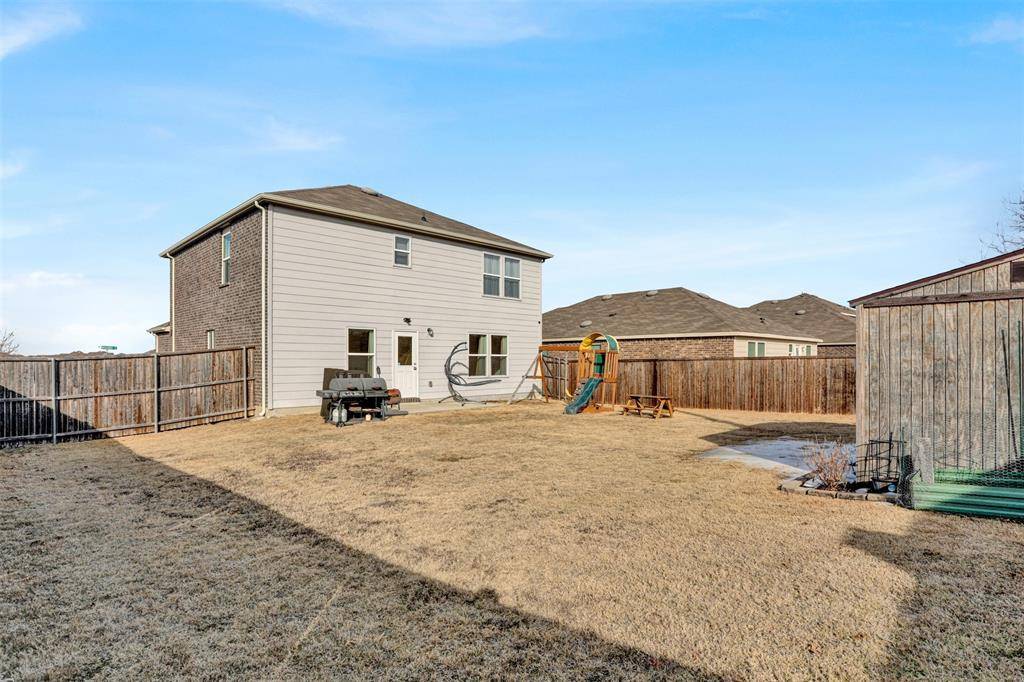 Welcome to this beautiful north-facing, move-in-ready four-bedroom home located in the highly desired Winn Ridge community in Aubrey. With no home directly in front, the property offers added privacy and an open view. Inside, you'll find upgraded LVP flooring with enhanced carpet padding, updated light fixtures, and a shiplap accent wall that adds warmth and character to the main living space. An electric fireplace creates a cozy atmosphere, while closet upgrades add everyday functionality. The home also features a Maytag whole-home water filtration system with reverse osmosis at the kitchen sink. Downstairs room can be used as a 4th bedroom, flex space or office!! Recent improvements include a new exterior AC unit, new garage door, and installed gutters. Outside, a custom-built shed provides additional storage or workspace. Thoughtfully maintained and located in a sought-after neighborhood known for its amenities and community feel, this home is ready for its next owner. Schedule your showing today and fall in love with this home! Ask us about our 3.375% FHA assumable loan!!