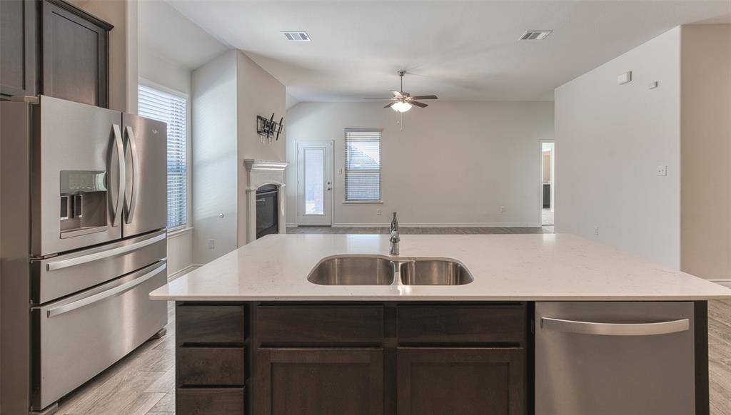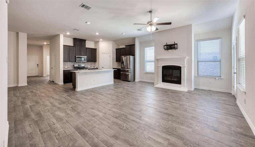 The main living area serves as the heart of the home, featuring a cozy fireplace and seamless sightlines into the expansive eat-in kitchen—perfect for both everyday living and entertaining. The kitchen is highlighted by a large center island, contemporary finishes, generous cabinetry, and ample counter space, making it ideal for casual meals, hosting gatherings, or simply enjoying time at home.