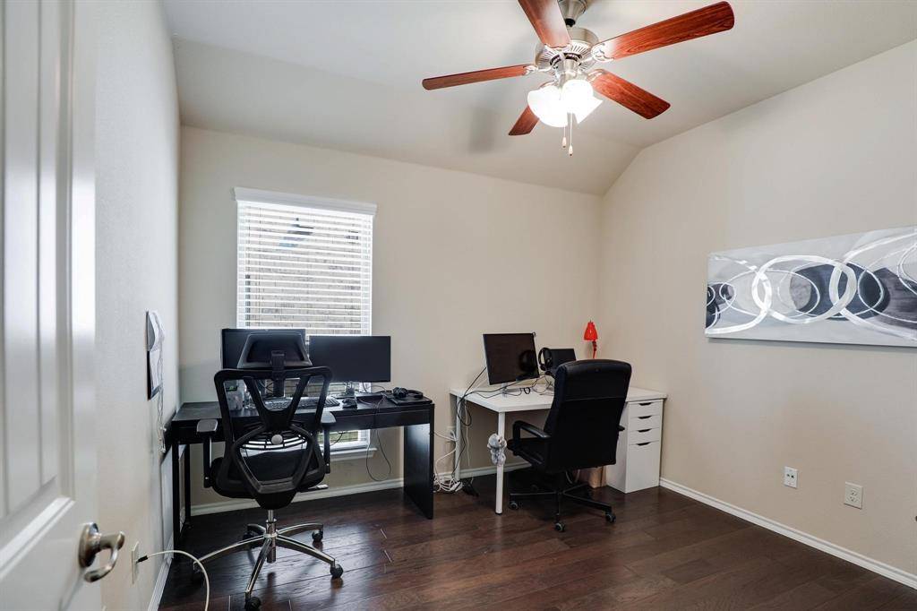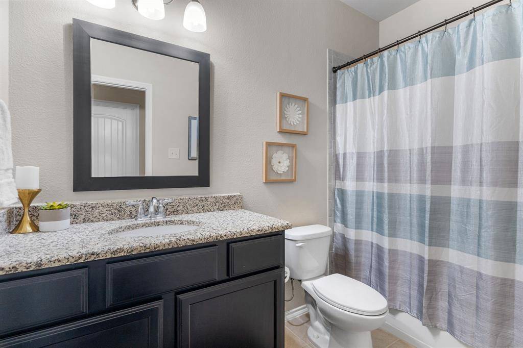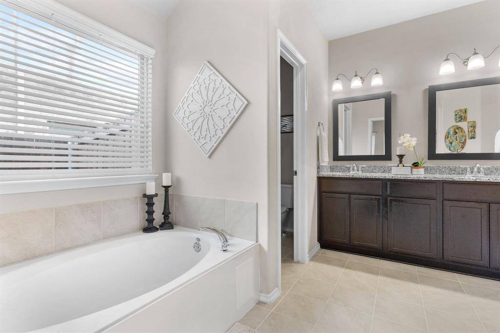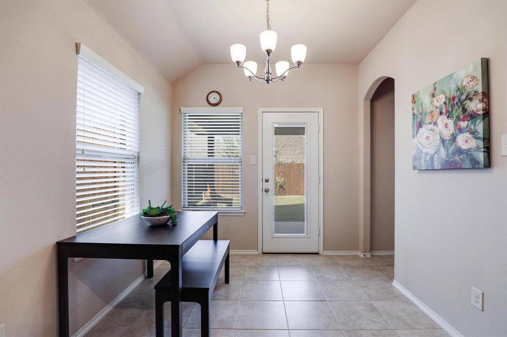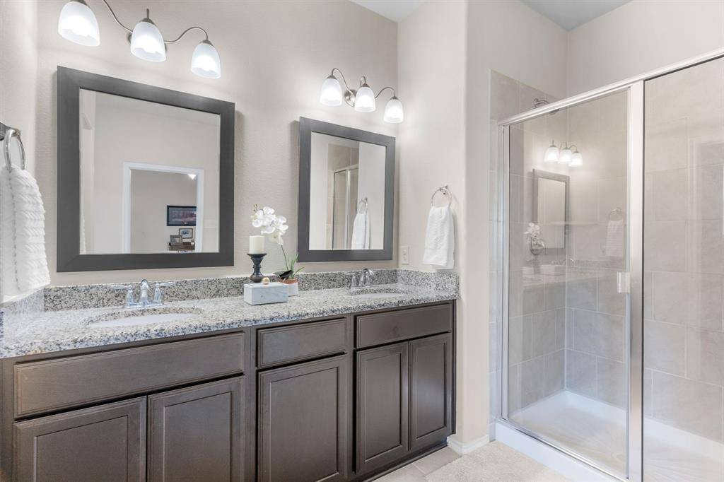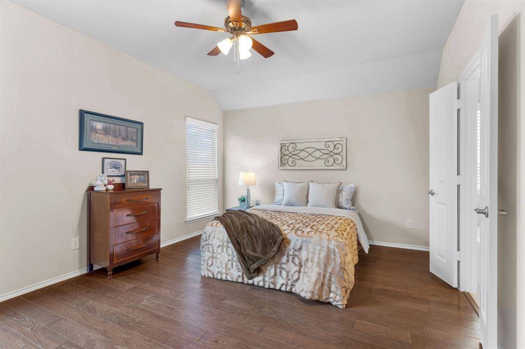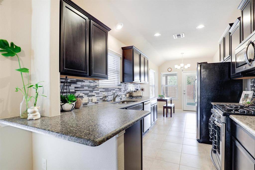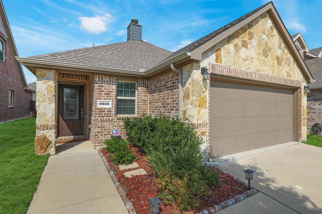 Beautiful single-story brick home accented with stone details, ideally located in the Fossil Creek at Westridge community in McKinney. A landscaped front yard welcomes you to a covered brick porch and a wood front door with frosted glass detailing, complete with a Ring doorbell camera. Upon entry, engineered wood floors extend throughout the home, complemented by abundant natural light and a vaulted 9-foot ceiling. The spacious living room features a ceramic wood-burning fireplace with gas starter, creating a cozy focal point, and includes a mounted TV. The pristine galley-style kitchen offers tile flooring, dark walnut cabinets with crown molding, leathered granite countertops, mosaic tile backsplash, an undermount dual sink, bar-height peninsula seating, Frigidaire stainless steel appliances, and an oversized walk-in pantry. The private primary suite features wood floors, serene backyard views from two windows, a vaulted ceiling with fan, and French doors to the en suite bathroom. The primary bath includes a walnut dual vanity with upgraded granite countertops and undermount sinks, updated walnut-framed mirrors, elegant glass light fixtures, a soaking tub, separate tiled shower, private water closet, and a generous walk-in closet with built-in shelving. Two secondary bedrooms feature wood floors, vaulted ceilings with fans, and ample closet space. A full bath offers a walnut vanity with upgraded granite countertop, updated mirror, and tub-shower combo. Additional amenities include upgraded arched interior doors, security system wiring, Honeywell thermostat, upgraded remote sprinkler system, transferable home warranty through May 2027, a 2-car garage, and recent updates including a 2023 roof, fresh paint, mirrors in both bathrooms, and patio tile. Enjoy the covered back porch with new tile flooring and ceiling fan, a spacious fenced yard, and access to the community pool just a one-minute walk away. Zoned for Prosper ISD.