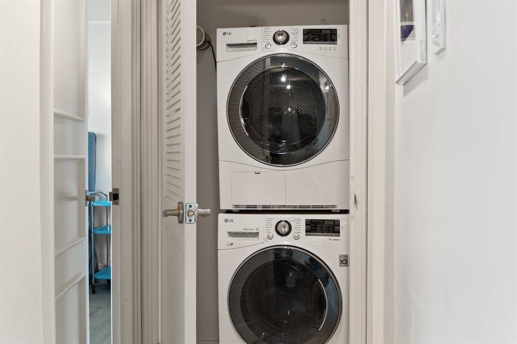 The primary suite is a true retreat, featuring three walk-in closets—a rare find in high-rise living.