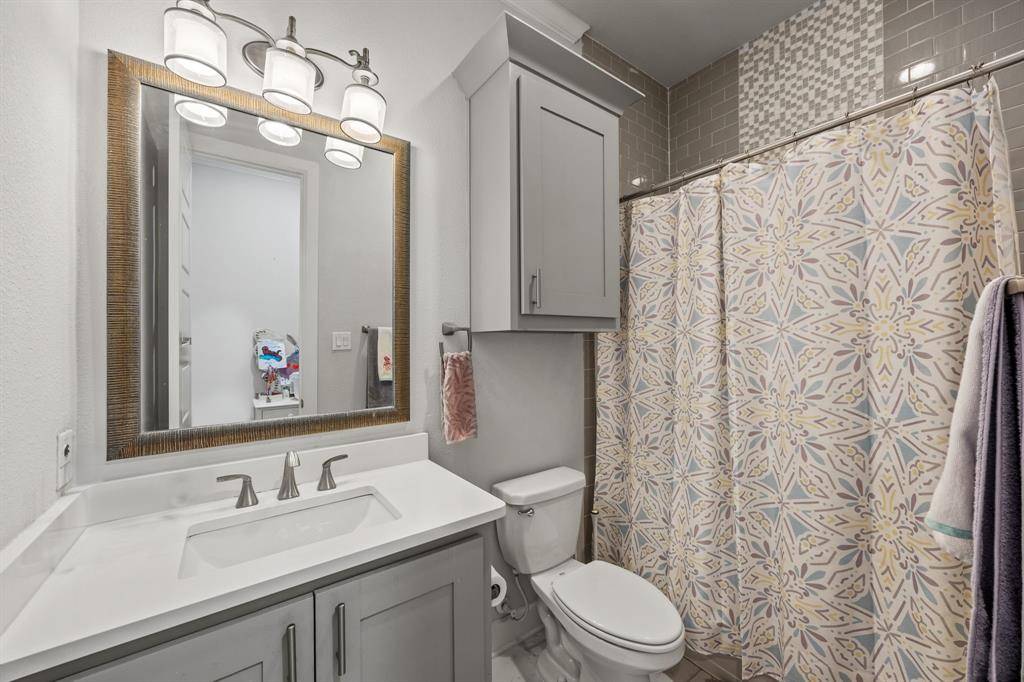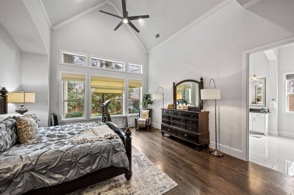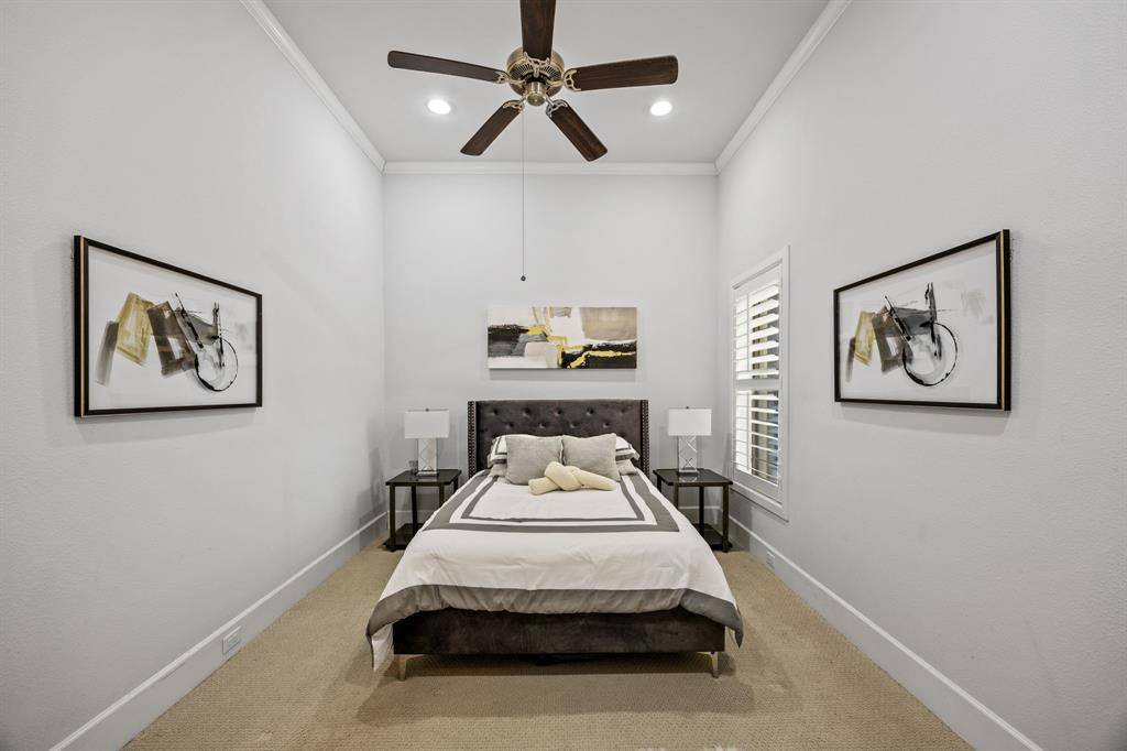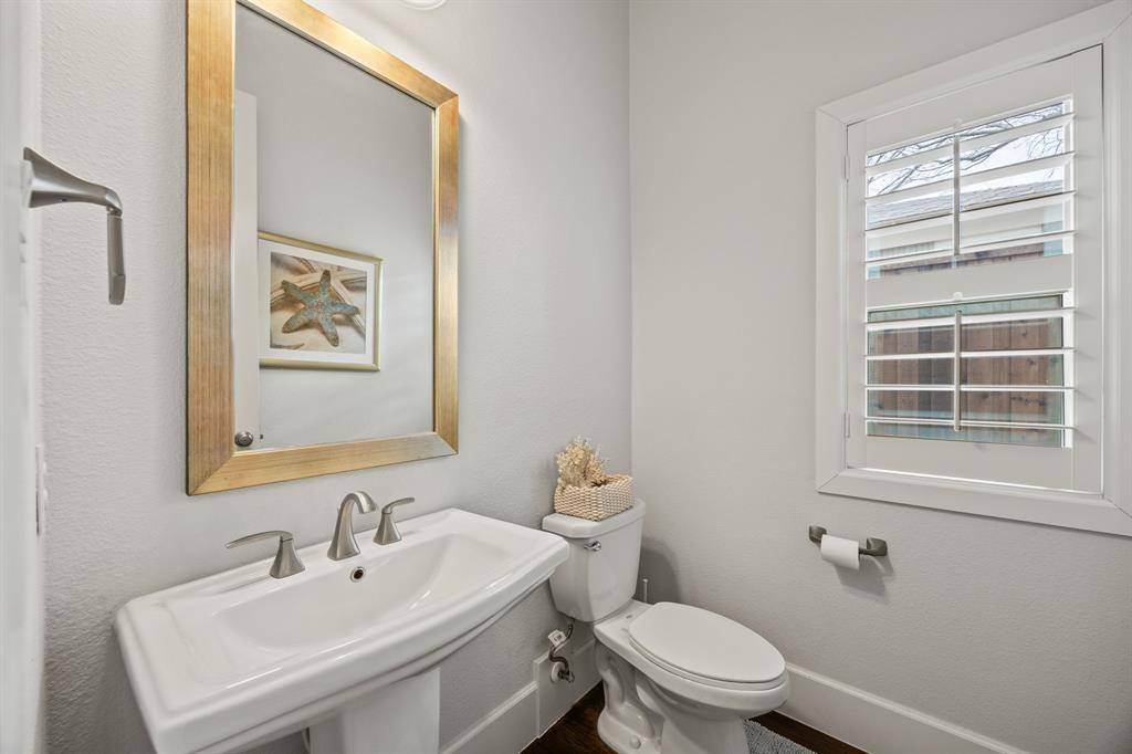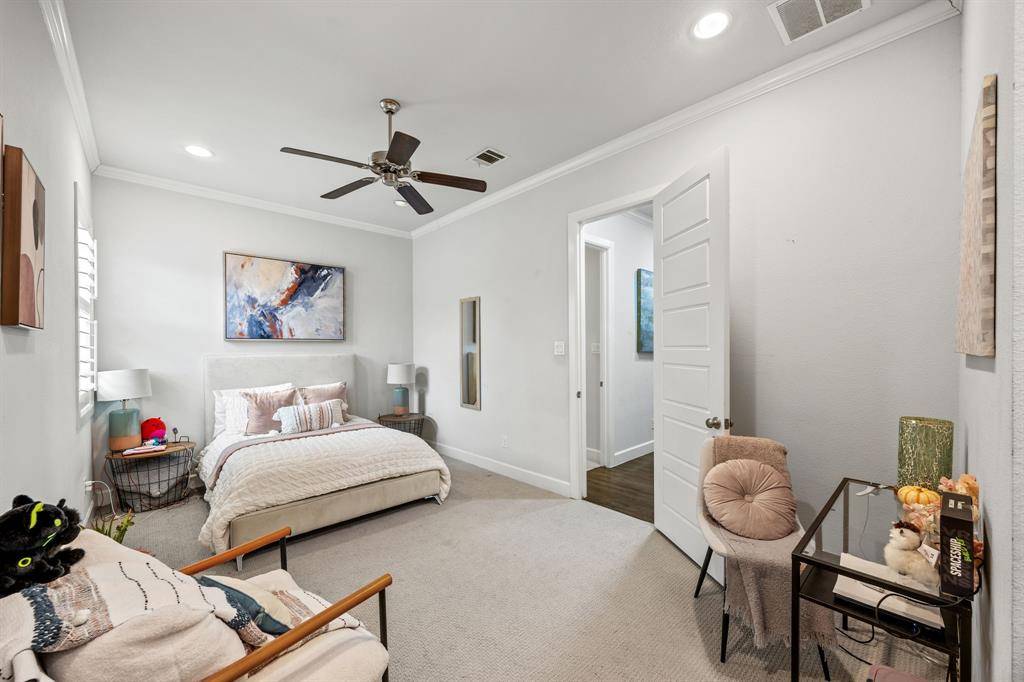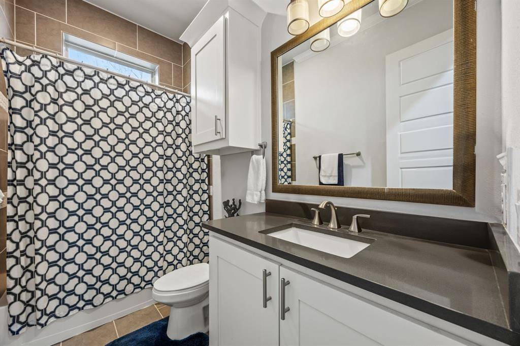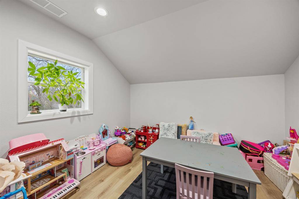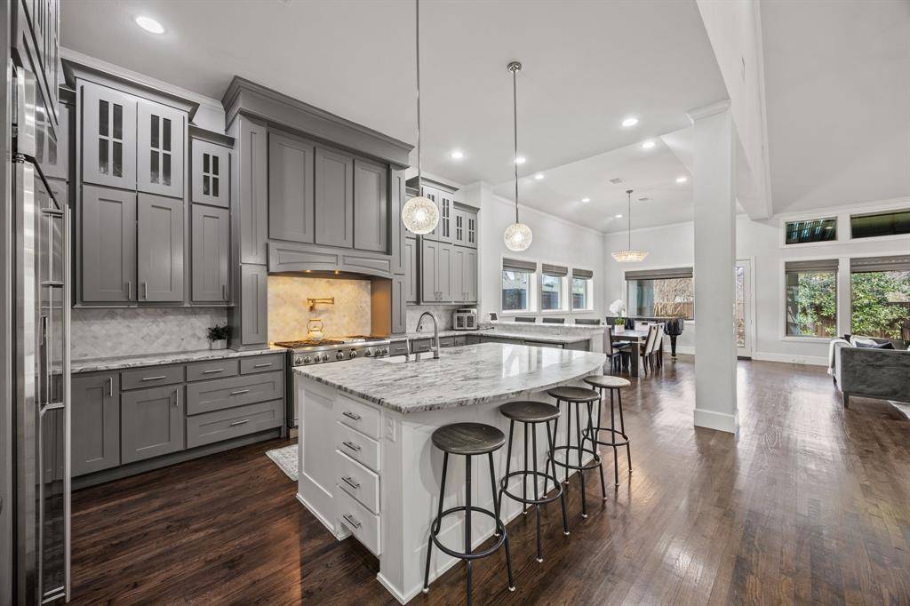 The kitchen is centered around an oversized marble-topped island with breakfast bar seating, abundant cabinetry, gas range, and GE Monogram appliances, creating a functional layout for everyday living and entertaining. French doors from the living area open to a covered backyard patio with gas fireplace, built-in grill, and outdoor refrigerator. The turfed, level oversized backyard includes a sprinkler system and board-on-board privacy fencing The first floor primary suite features a cathedral ceiling and spa-like primary bath. A guest bedroom and one and a half additional baths on the main level provide versatility for visitors or multi-use needs. Upstairs includes three additional bedrooms and a large playroom or bonus space. Attached side-entry three-car garage and ample storage. Located minutes from White Rock Lake, Lakewood shopping and dining corridors, and nearby parks. Includes 3D walkthrough and virtual tour media. Oversized lot dimensions, outdoor living features, and a flexible floor plan distinguish this property within the Lakewood area. Seller to replace carpet or provide buyer a closing cost credit. This is one you won't want to miss!