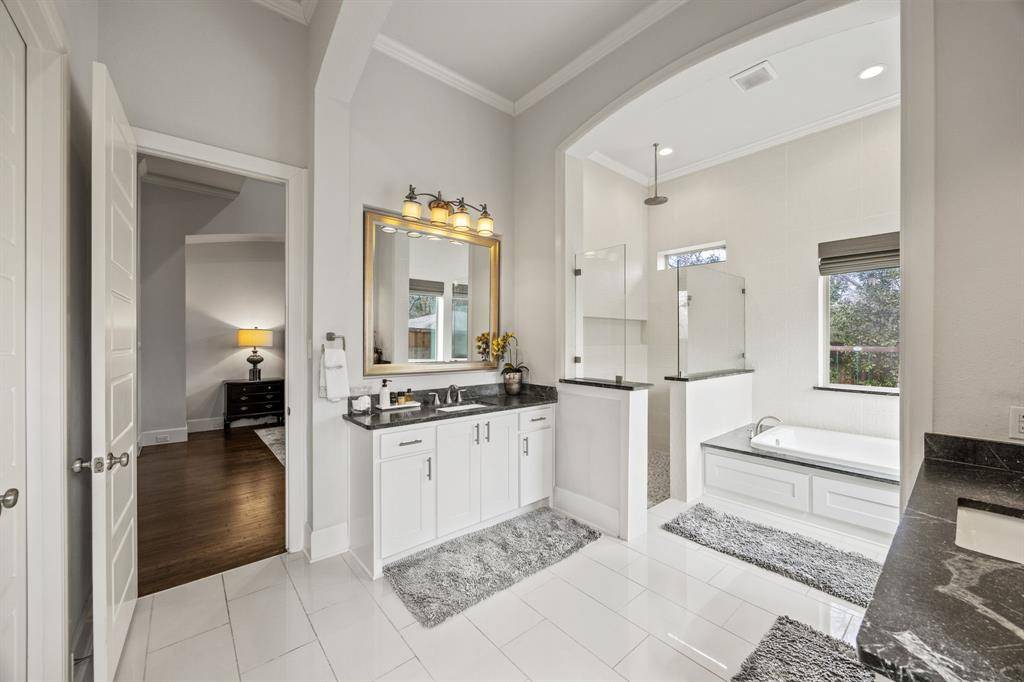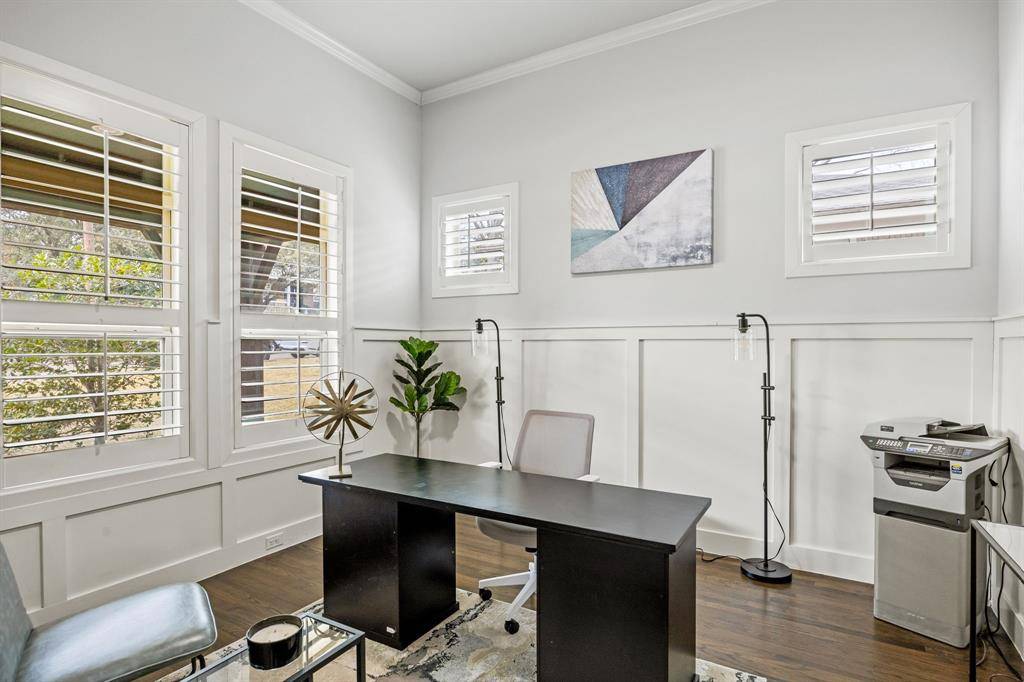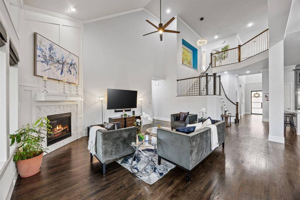 Located on a rare oversized 0.26-acre lot (73' x 155') in Lakewood's Bob O Links Downs, this 2015-built Hill Country–style residence offers 5 bedrooms, 6 baths, and approximately 4,129 sq ft of living space. A glass-paneled front door opens to a spacious entry and a dedicated home office with glass doors. The open-concept main level features rich hardwood floors, high ceilings throughout, and a gas fireplace anchoring the main living area.
