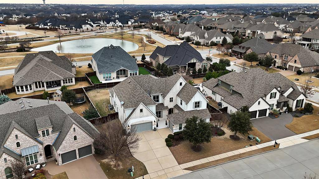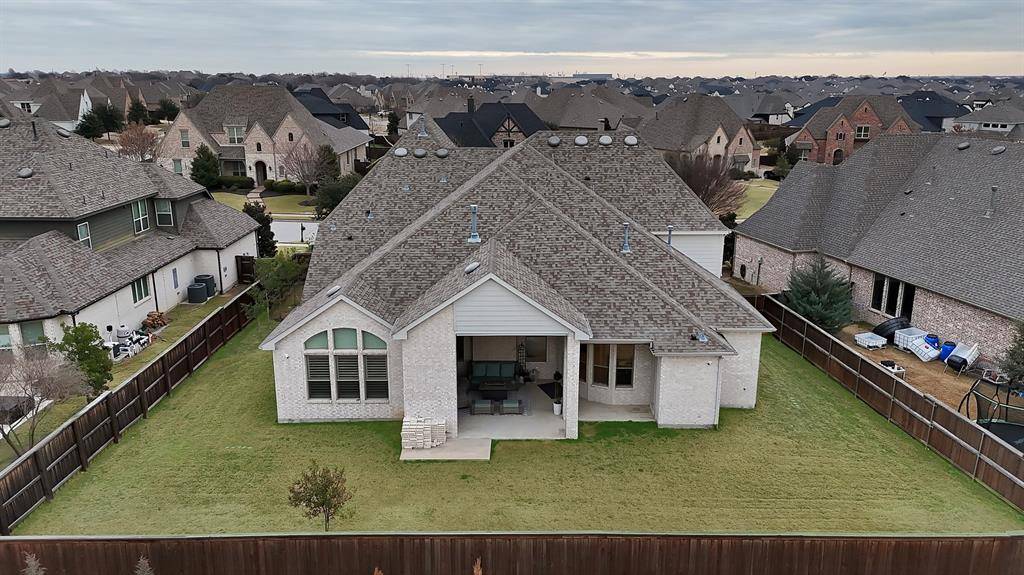 Step outside to a backyard designed for future dreams. The space is ready for your custom pool design, with a pool bath already in place for convenience. The covered back patio, featuring an automatic screen enclosure, is the perfect setting to unwind while enjoying breathtaking Texas sunsets. Located in the prestigious Mustang Lakes community, residents enjoy access to one of the area's most impressive master-planned neighborhoods including a 12,000-square-foot amenity center, resort-style pool, state-of-the-art fitness center, lighted tennis and sport courts, and 18 miles of scenic trails winding through parks and tranquil lakes.