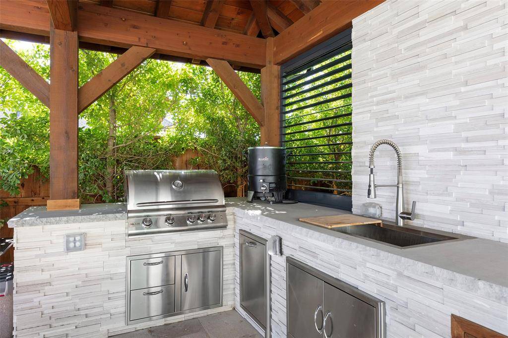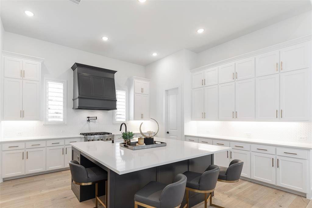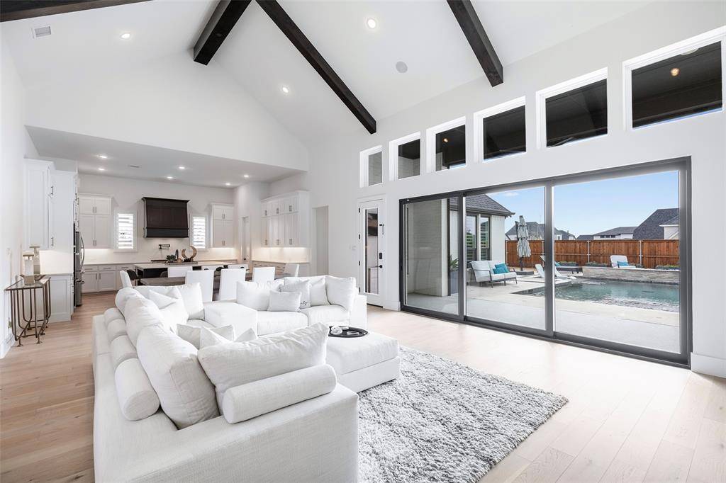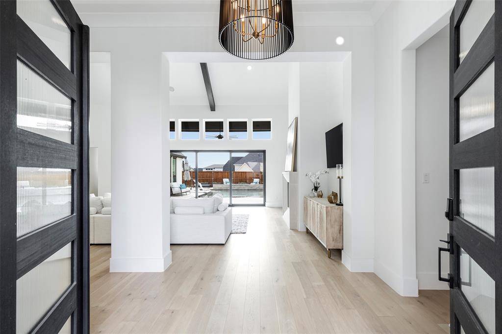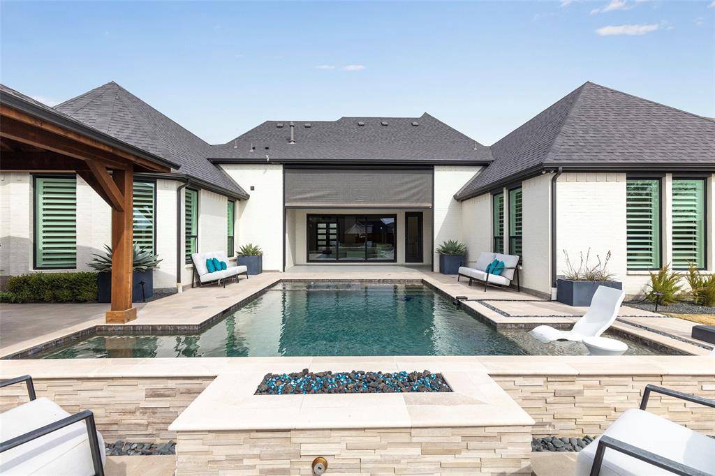 This SINGLE-STORY home in Mustang Lakes, one of Celina's most sought-after master-planned communities, is designed for both serious entertaining and wine collection. The gated courtyard features outdoor speakers that set the tone for refined gatherings. At the heart of the home is a remarkable, custom walk-in, temperature-controlled wine room with up to 1000 bottle capacity. Enclosed in wrought iron with LED lighting, the space includes a tasting bar, an adjoining sitting area, and a custom-built service armoire, over $100K enhancement. Soaring vaulted ceiling and open-concept living spaces transition seamlessly to the outdoors through a dramatic folding glass wall that opens the living room to the backyard. An electric screen allows the patio to be fully enclosed when desired, creating year-round flexibility. An in-home media system extends throughout the residence, including all common areas and primary suite. Natural light floods the kitchen with a huge island, double ovens, pot filler, and a generous amount of ceiling height cabinetry and quartz counterspace. All bedrooms have ensuite baths. The backyard is designed to rival private resort settings, showcasing a custom-designed pool with hot tub, tanning bed, waterfall feature, programmable light show, and firepit. A stand-alone, covered outdoor Cabana kitchen provides extensive functionality with a grill, sink, refrigerator, storage, bar seating, and generous countertops, ideal for both intimate evenings and large-scale entertaining. An outdoor half bath with a dedicated pool storage closet adds thoughtful convenience. Beautiful landscaping completes the experience with seven RH Zinc planters, custom lighting, and irrigation, creating architectural symmetry and evening ambiance. Offering the ease of single-story living combined with architectural wine presentation and true indoor-outdoor integration, this Mustang Lakes residence delivers distinction, scale, and lifestyle in one extraordinary home.