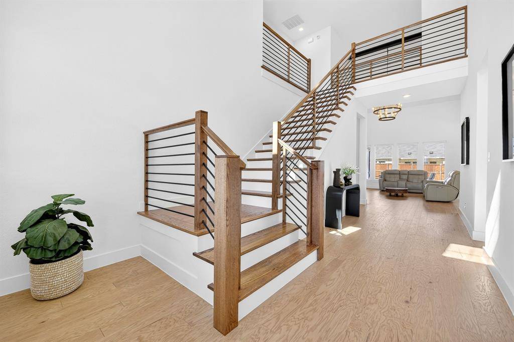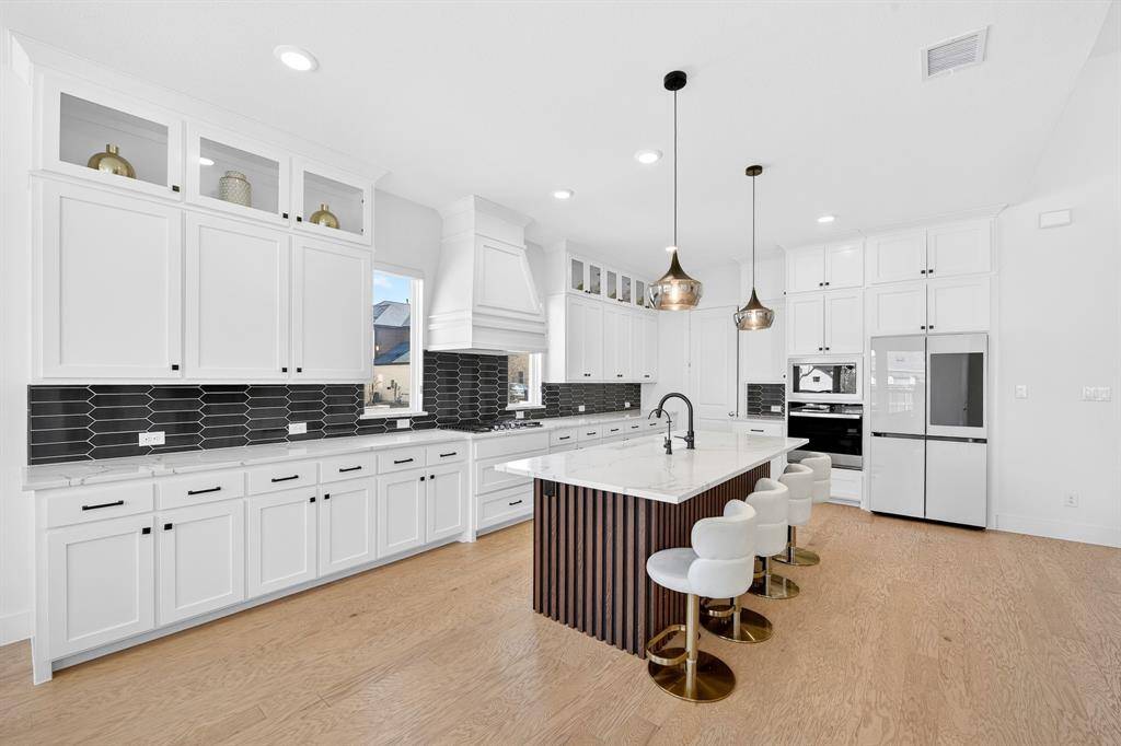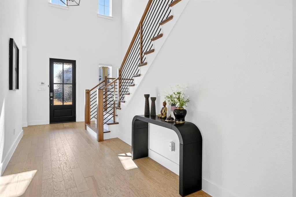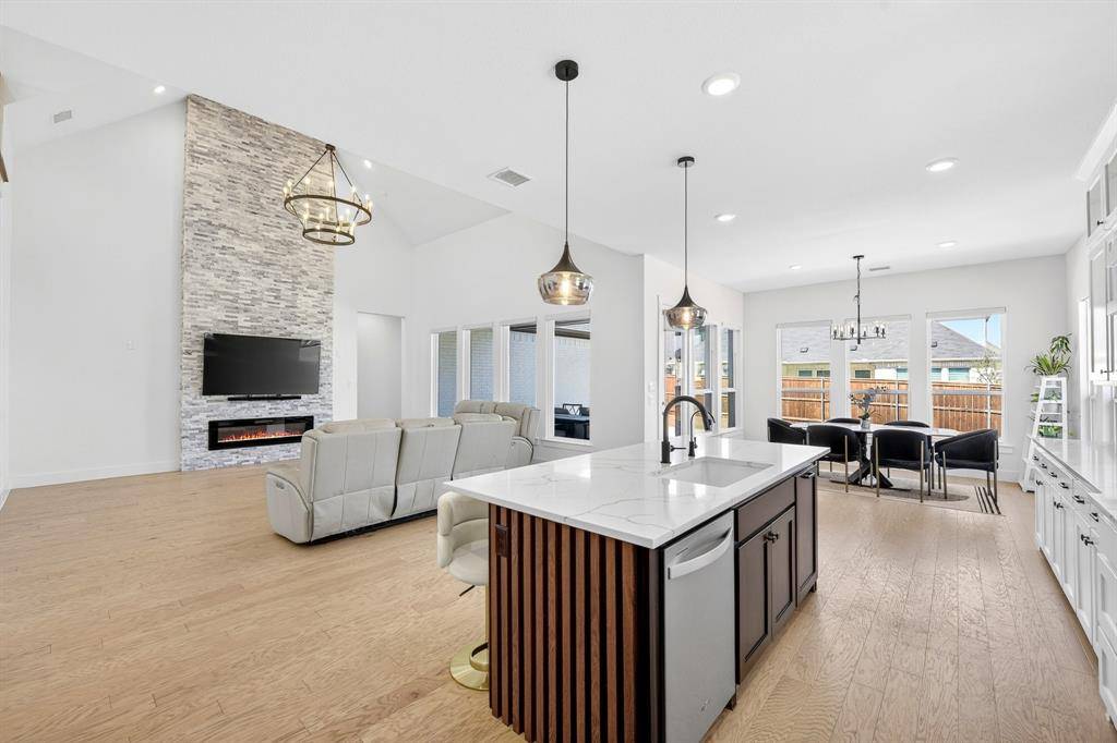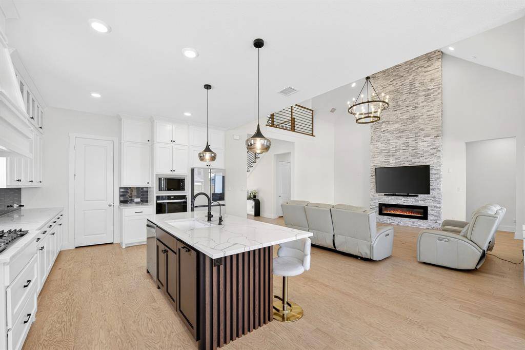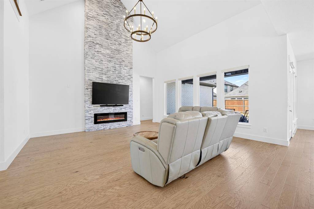Step into refined living in the heart of Celina Hills. From the moment you enter, soaring ceilings and abundant natural light create a grand first impression. Light wood floors lead you into a stunning living room anchored by a floor to ceiling stone fireplace and expansive windows, offering the perfect balance of comfort and sophistication.