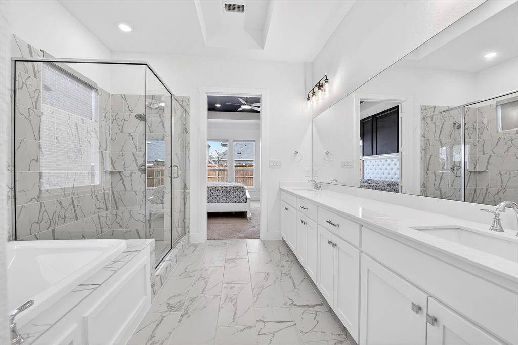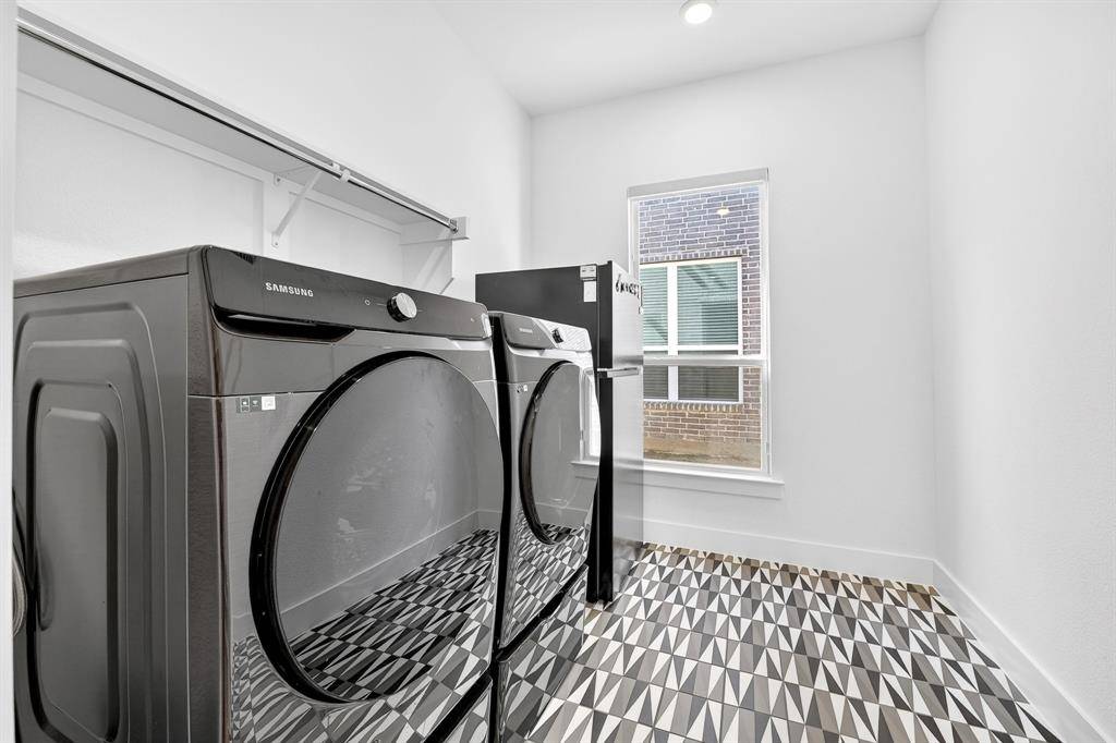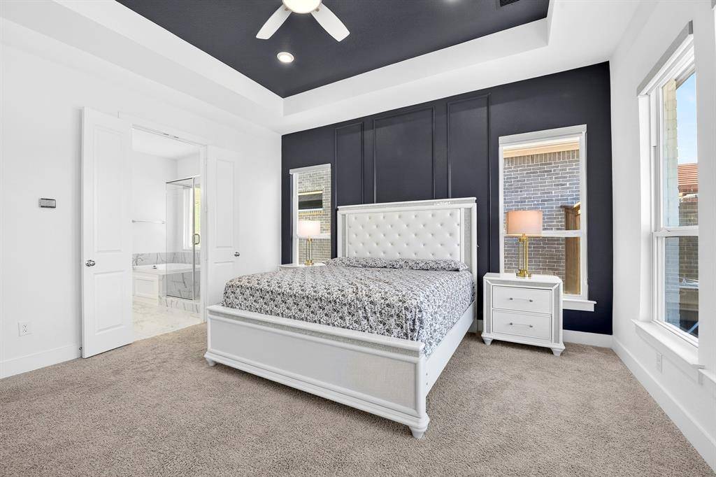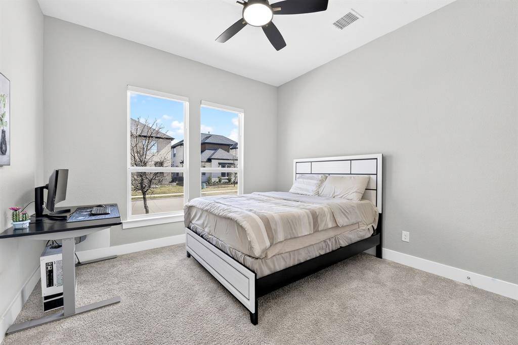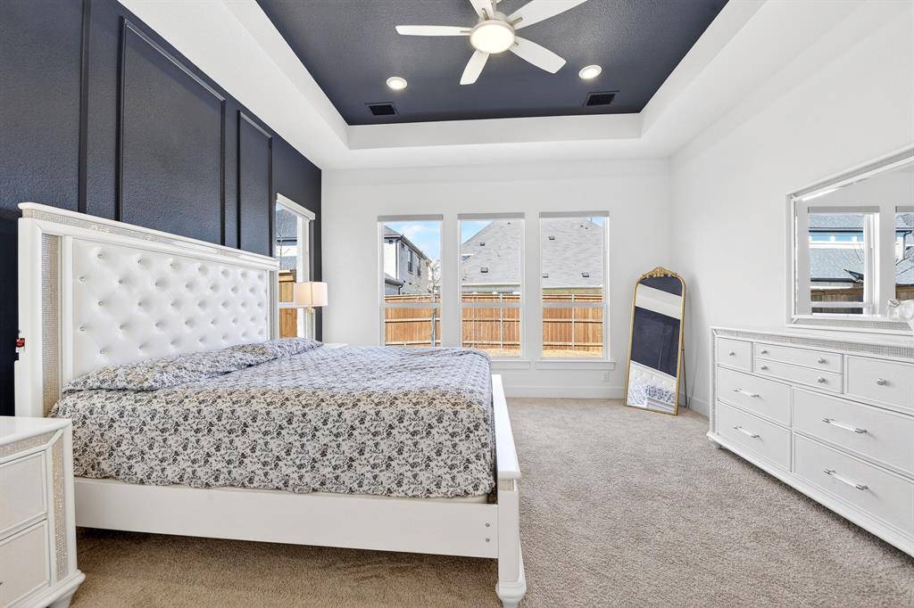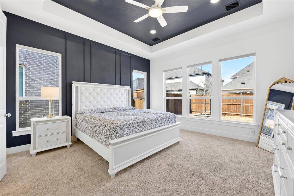 Outside, enjoy a covered patio with an outdoor fan and extended concrete, perfect for gatherings under the Texas sky. Smart switches, roller shades, customizable Govee lighting, a full Ring security system, and a built in Tesla charger complete this beautifully upgraded, move in ready home.