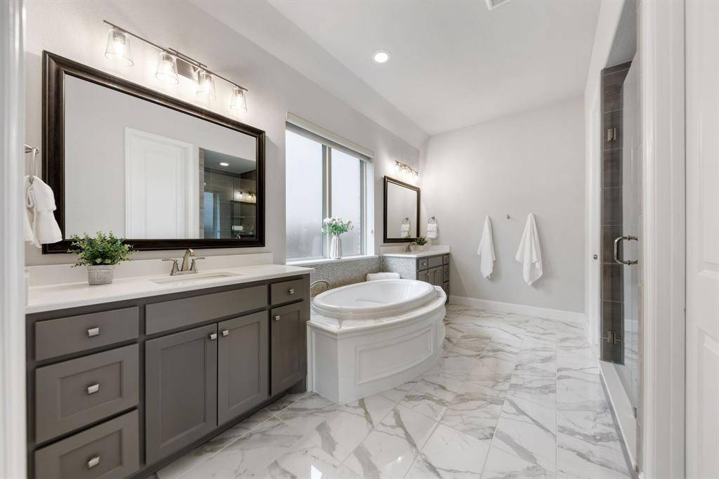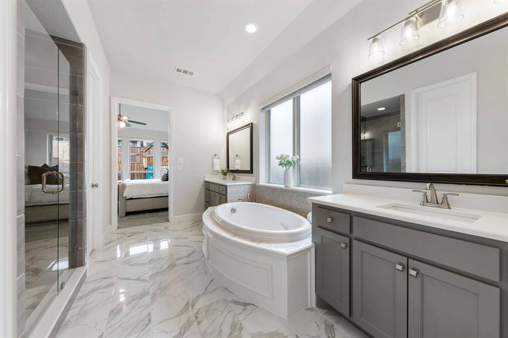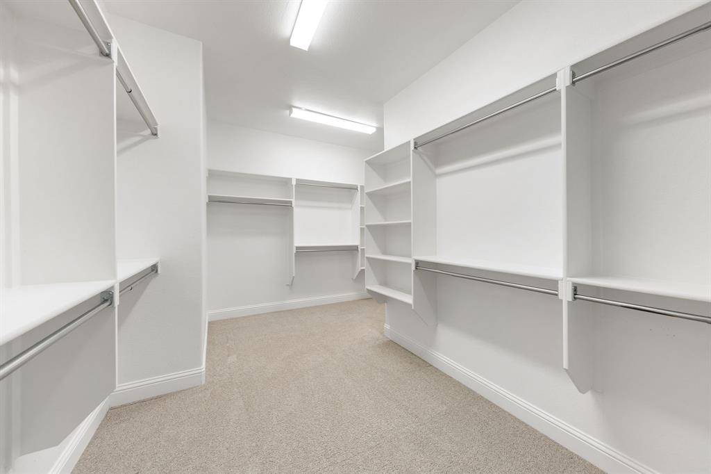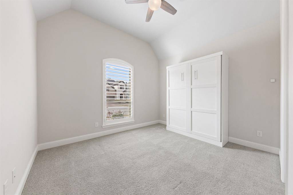 The three-car garage features a premium epoxy polyuria floor coating and includes a water softener hookup. Stone flower bed landscaping enhances the curb appeal, adding clean structure to the front elevation. The guest room includes a custom Murphy bed frame that conveys with the home, adding flexibility and functionality.