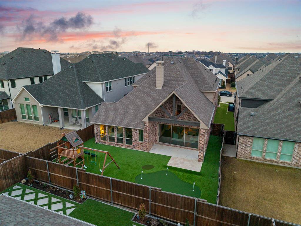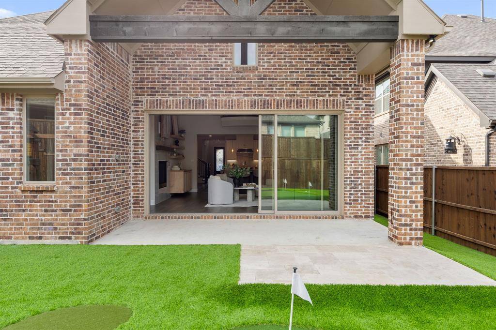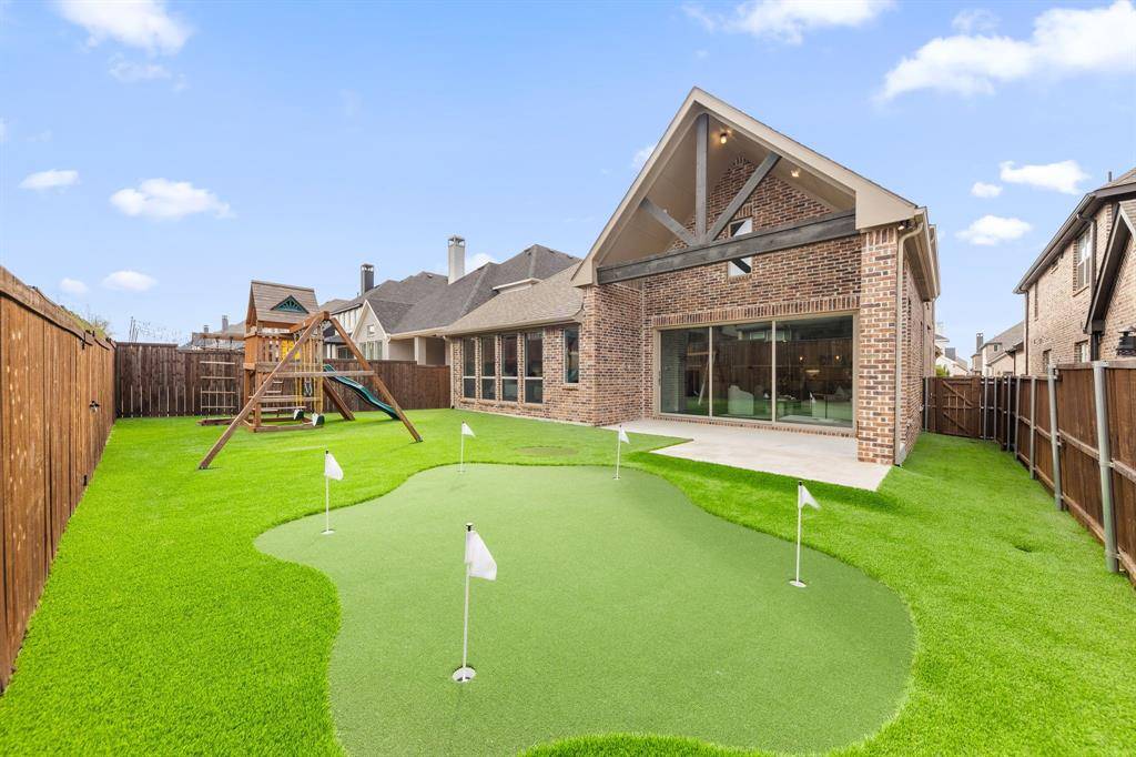 The backyard is built for enjoyment with a private turf putting green and a playground set that can convey with the home, offering a rare blend of recreation and relaxation.