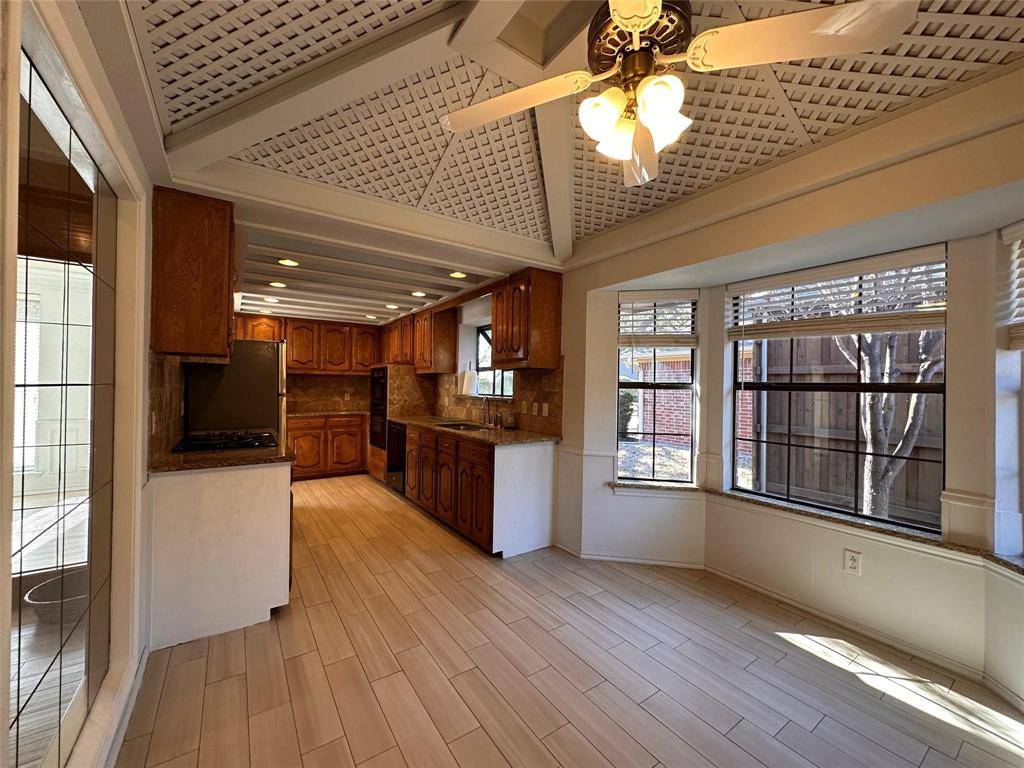 Updated and charming 4-bedroom 2.5-bathroom house with a pool. Home features updated durable wood look flooring throughout most of the high traffic areas. Updated kitchen features granite counters, a custom backsplash, double ovens, a dining area with built in storage, lots of counter+storage space, and fridge is included. Primary suite features a tray ceiling, great views of the backyard and an attached bathroom with separate tub+shower, dual sinks, a skylight, and a spacious closet. Indoor+outdoor Seating area with a wet bar, wood paneling and custom tile opens up to a backyard that is great for entertaining and features a beautiful pool and lots of space for grilling and seating. Property owner pays for pool maintenance. 2 car garage features built in shelving for extra storage and an extra fridge. Washer and dryer are included. Close to dining, shopping entertainment, desirable schools, and just short commute to Downtown Dallas.