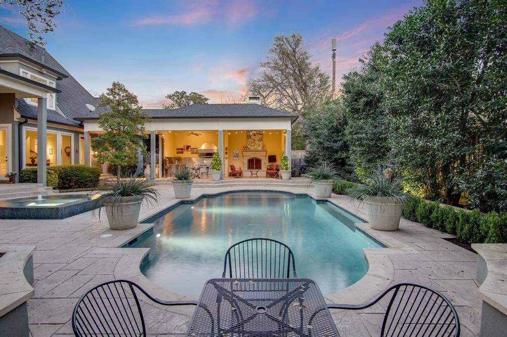 Outdoors, you'll find a true retreat. A large pool and separate oversized spa anchor the expansive terraced deck, creating the perfect setting for entertaining or relaxing. The outdoor living area is complete with a chef's kitchen, a dedicated sitting area, and a stunning cast-stone fireplace — an entertainer's dream.