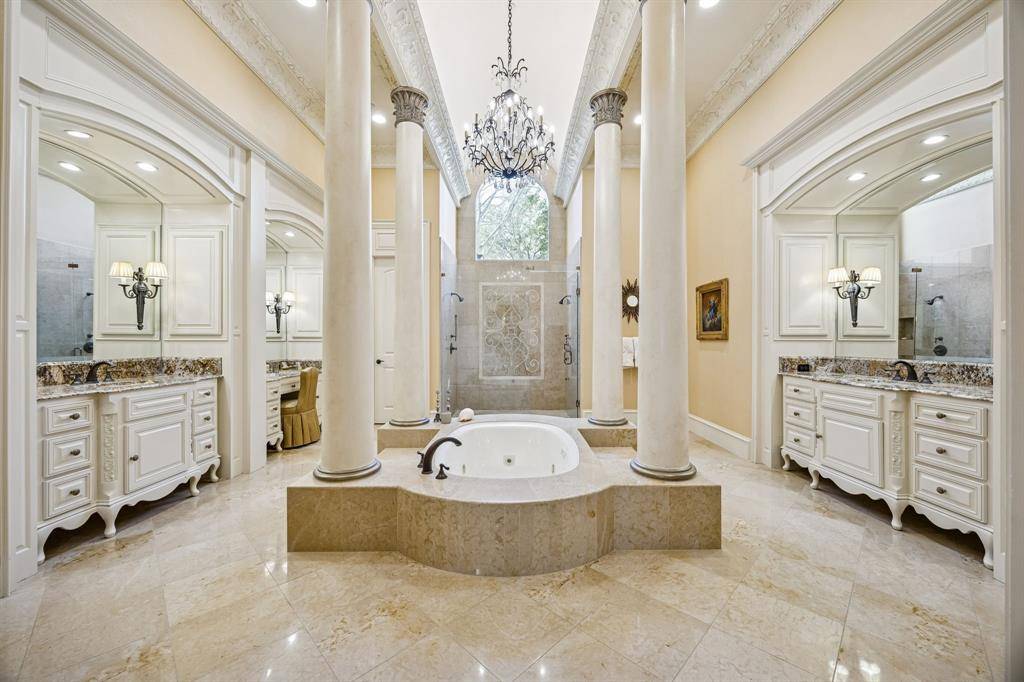 Elegant formal living, expansive great room create which opens to gourmet kitchen - Sub-Zero, dual dishwashers, double oven, & refined brass hardware & walk through wet bar. The primary suite in a private secluded wing with ornate hall with detailed ceiling work, absolutely stunning! Includes fireplace, spa tub, his & hers walk in custom closets.