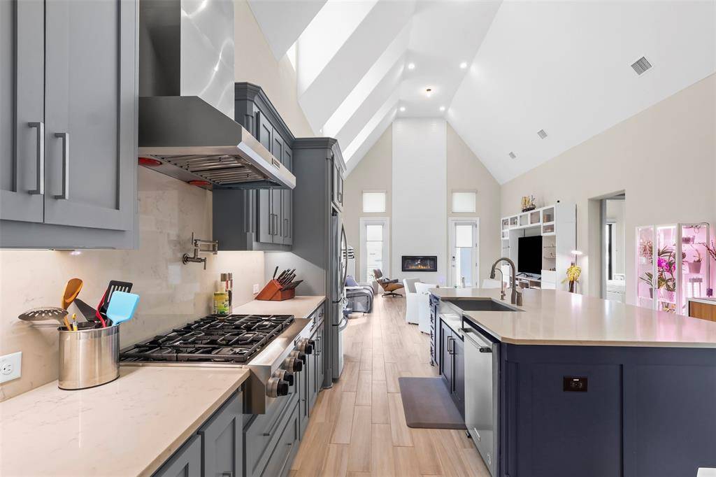 Welcome to your dream home — a custom Toll Brothers residence on a premium lakefront lot with peaceful water views. Enter through an elegant iron door into a thoughtfully designed floor plan featuring a main-level family room with fireplace, chef's kitchen with large island and breakfast nook, formal dining room, large private study, and an oversized primary suite with spa bath and fully customized California Closet. Beautiful wood stairs lead upstairs to a second living area, media room, and two generous secondary bedrooms. The backyard is a true resort retreat with a covered patio, built-in outdoor kitchen, and an oversized patio - all overlooking the lake. Premium upgrades include ShelfGenie pull-outs throughout, California Closets, built-in speakers, custom blue toothed controlled and powered shades, garage epoxy floors and overhead slat storage, solar panels, extensive storage, two EV charging stations in the garage and backyard pre-wired for TV and sound. This rare lake-view home blends designer finishes with exceptional functionality for effortless entertaining and everyday living.