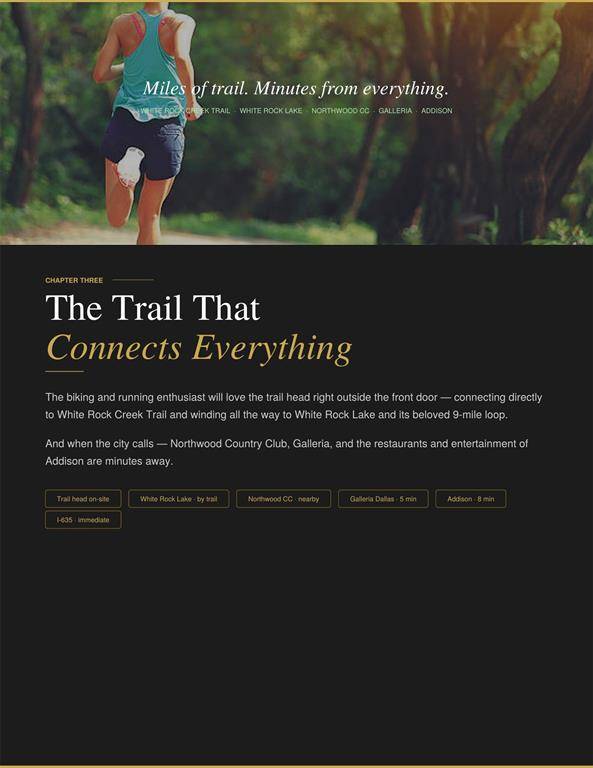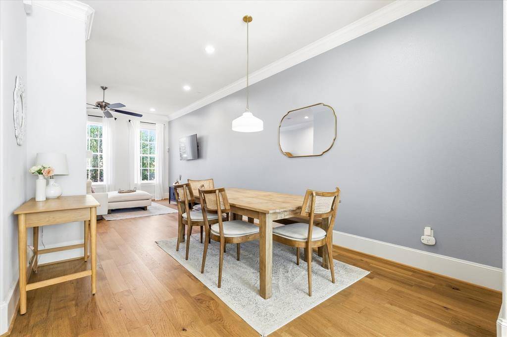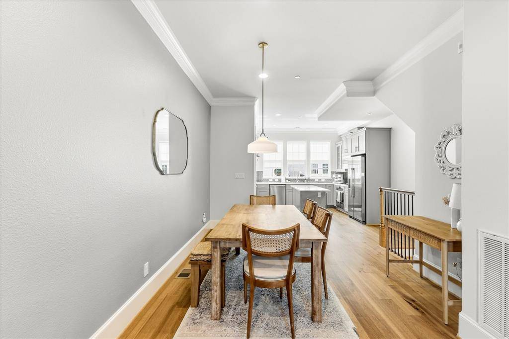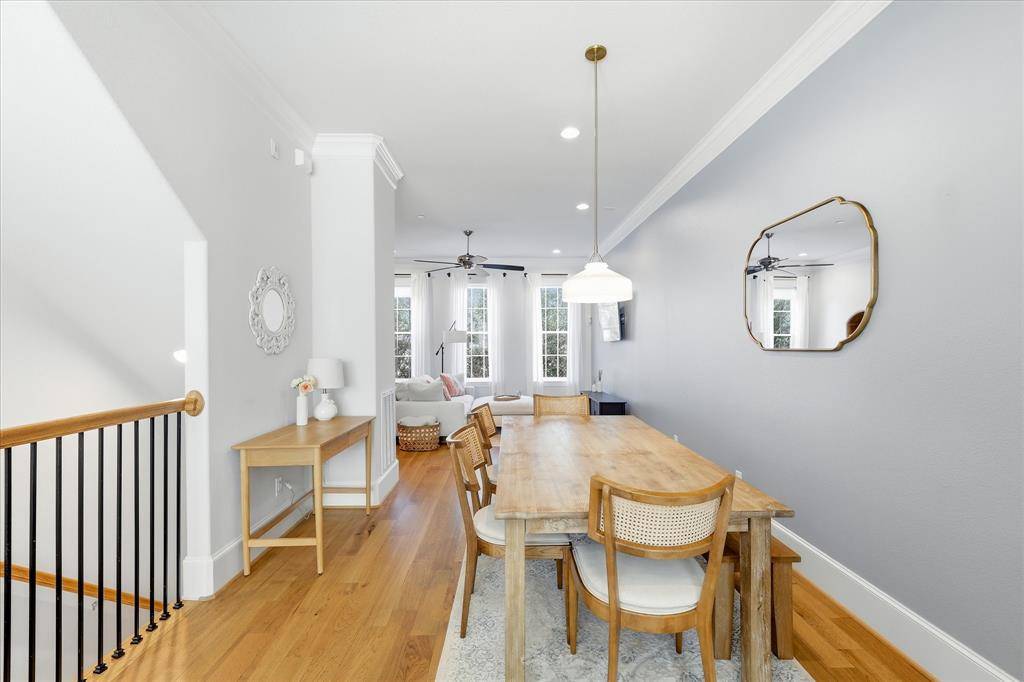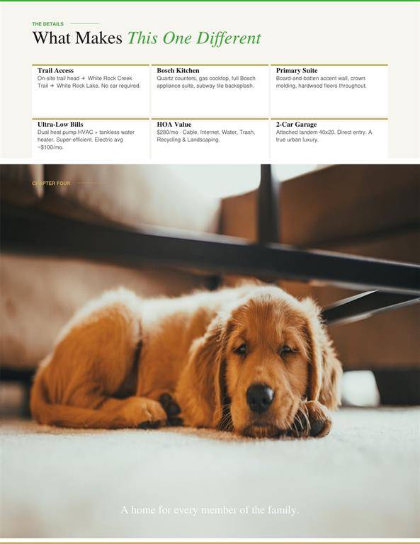 Modern 3-level brick townhome in a prime Dallas location with direct access to White Rock Creek Trail and White Rock Lake—no car required. This 2-bedroom, 2.1-bath home offers 1,350 sq ft of stylish living with hardwood floors throughout, a primary suite with board-and-batten accent wall and crown molding, and a beautifully appointed Bosch kitchen featuring quartz counters, gas cooktop, full appliance suite, and subway tile backsplash. Built in 2019, this home also includes a dual heat pump HVAC system and tankless water heater for ultra-low utility costs. Enjoy the convenience of an attached 2-car tandem garage with direct entry, plus HOA-covered cable, internet, water, trash, recycling, and landscaping. A rare combination of modern efficiency, low-maintenance living, and unbeatable trail access.